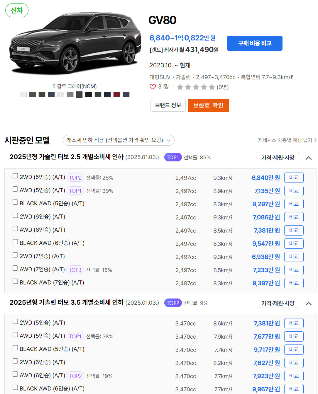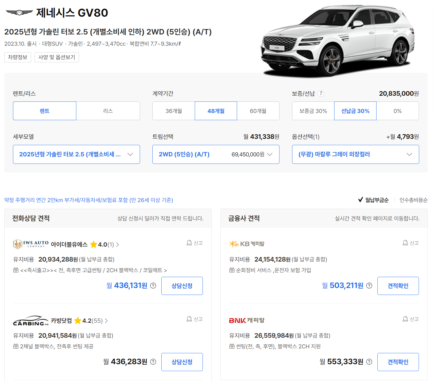 제네시스 GV80을 장기렌트로 이용할 경우, 월납입금이 차량 옵션과 계약 조건에 따라 다르게 설정됩니다. 예를 들어: