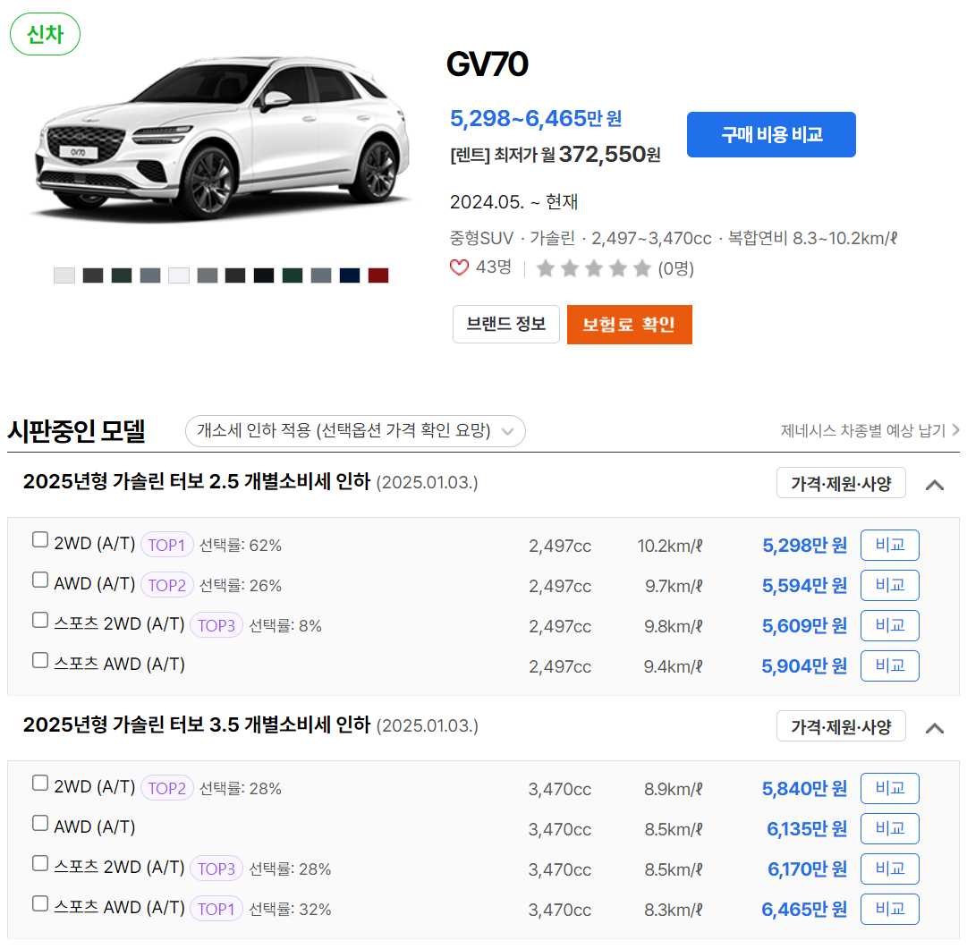 GV70은 2025년형 가솔린 터보 2.5 & 3.5 모델로 제공되고 있습니다. 차량의 신차 가격은 53,800,000원에서 시작하며, 장기렌트를 통해 초기 비용 부담을 줄이면서도 최신 모델을 경험할 수 있는 이점이 있습니다.