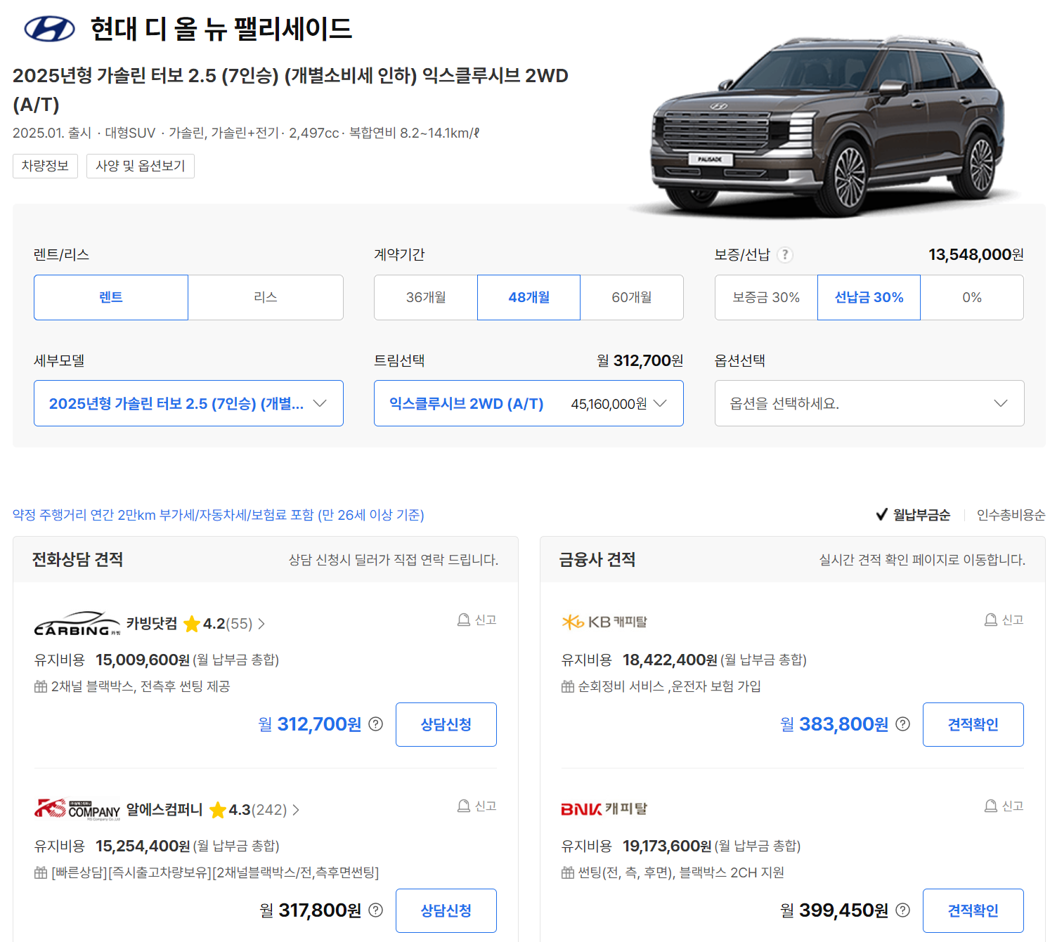 팰리세이드의 장기렌트 비용은 계약 조건에 따라 월 320,440원부터 시작됩니다. 여기서, 계약기간이나 보증금 등 다양한 설정에 따라 월 납입금이 다를 수 있습니다. 예를 들어, 익스클루시브 4WD A/T 모델의 월 납입금은 341,050원이며, 더 높은 트림인 캘리그래피 4WD A/T는 397,140원까지 올라갑니다. 각기 다른 옵션과 트림에 따라 선택의 폭이 넓어, 필요에 맞는 최적의 선택이 가능합니다.